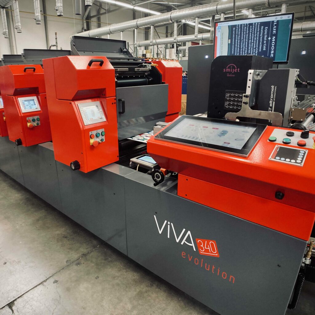 Basée sur la technologie Aniflo et s’appuyant sur le même concept de production que le numérique (finition hors ligne), la Viva 340 evolution imprime bobine-bobine, avec le choix d’imprimer en CMYK, en multichromie, ou en tons directs (ce qui n’est pas possible en impression numérique).